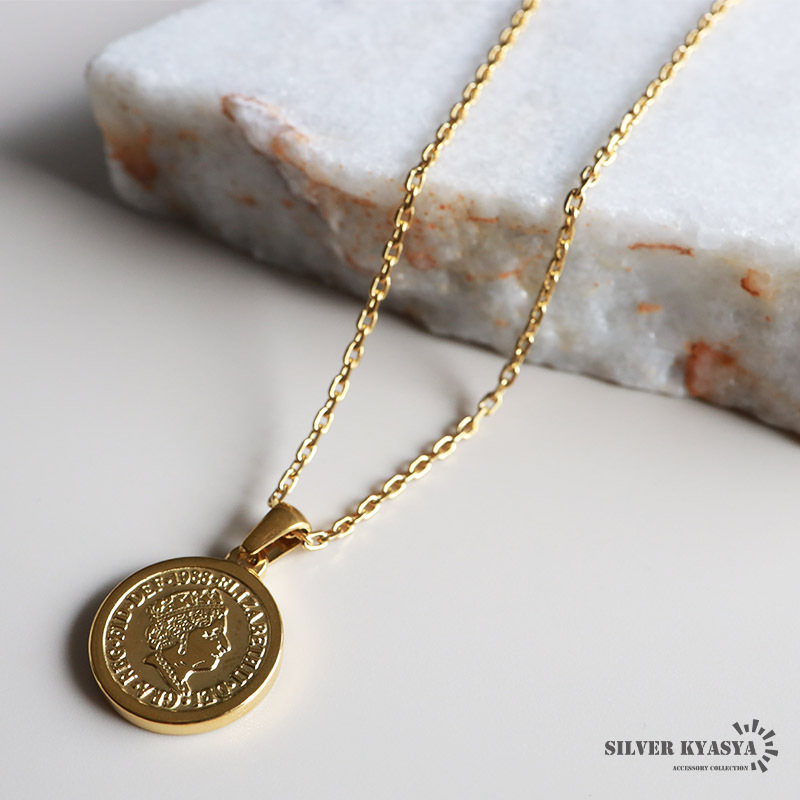 > (45cm) コインネックレス 4面カット あずきチェーン エリザベス女王 ゴールド 18K ステンレス 金属アレルギー対応