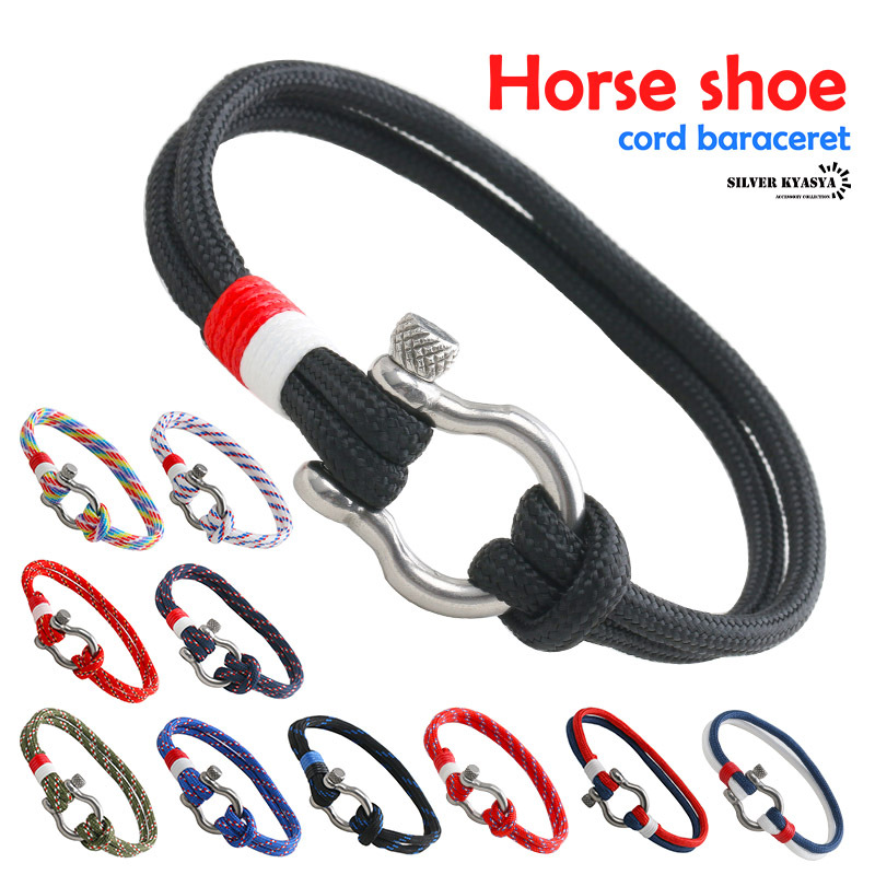 > (F-ブルー&レッド&ホワイト) 馬蹄 ブレスレット コードブレスレット 紐 ホースシュー カラフル ビビット シルバー