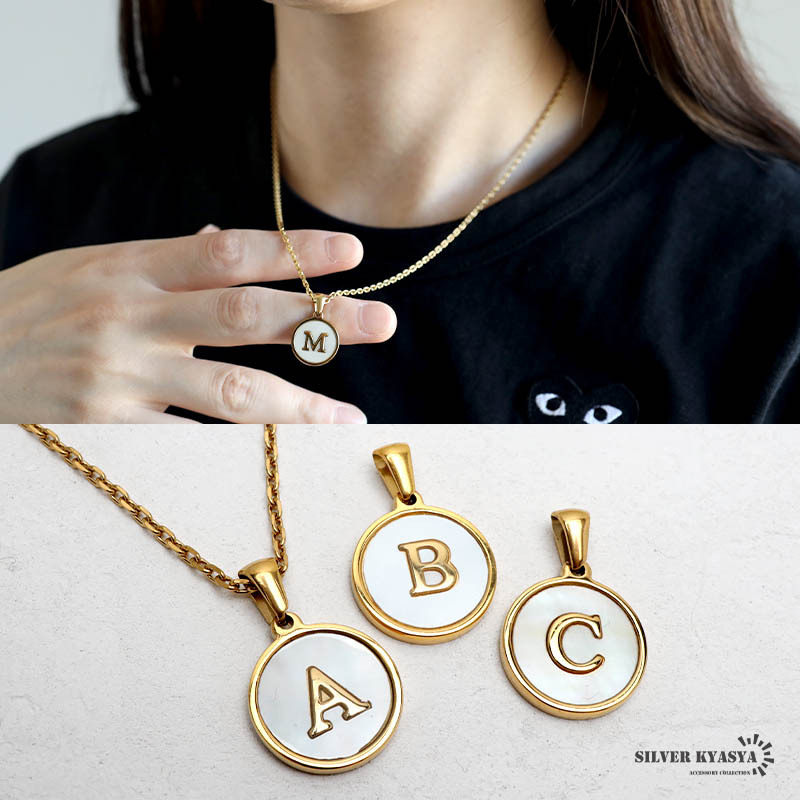 > (K、50cm) イニシャルネックレス ゴールド ホワイト ラウンド ステンレス 18KGP あずきチェーン 金属アレルギー対応