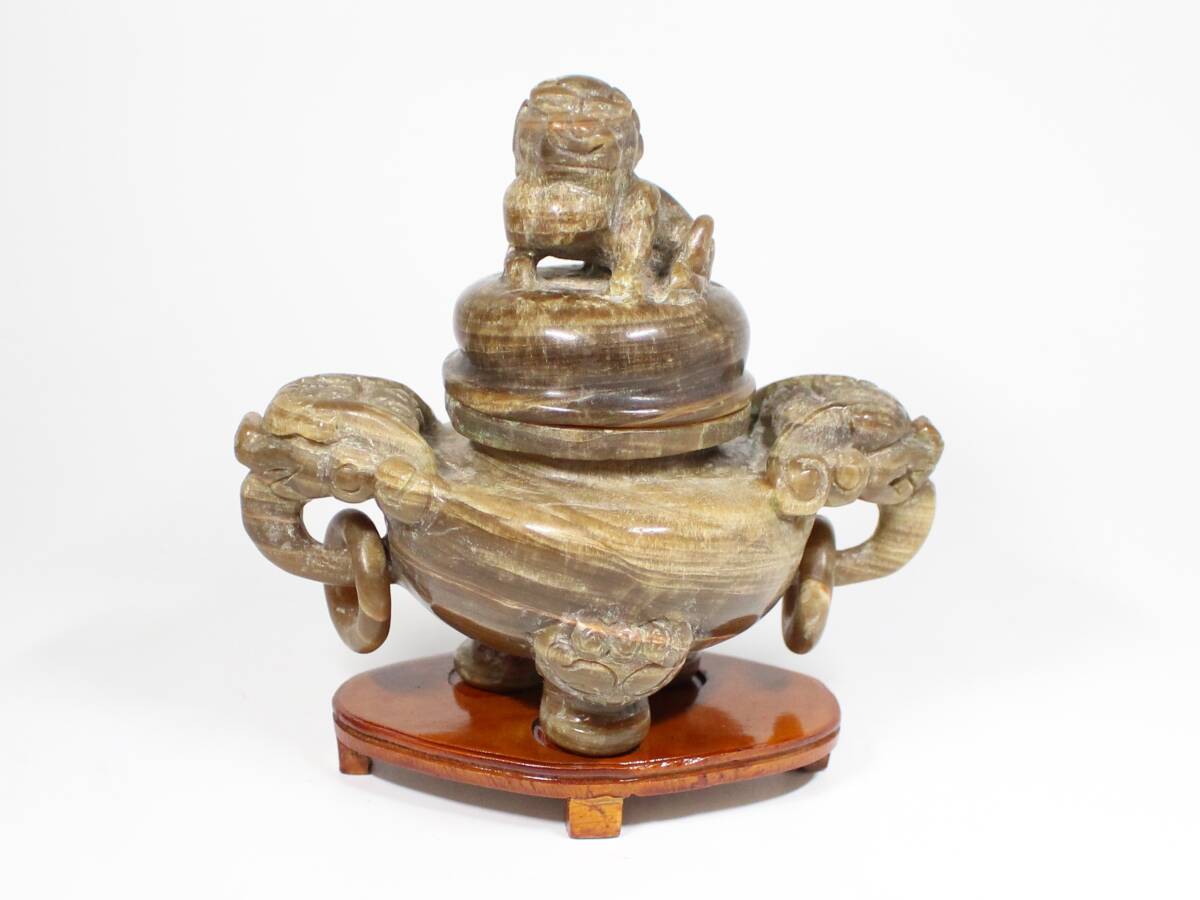 - ▲中国美術・玉石・香炉・獅子つまみ蓋・象・双耳・三足・獣足・唐木台・香道具・箱付▲se318M