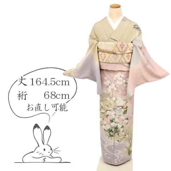 - 【訪問着】 長尺 色紙に麗しの花々模様 灰ピンク 袷正絹着物 HY12-8