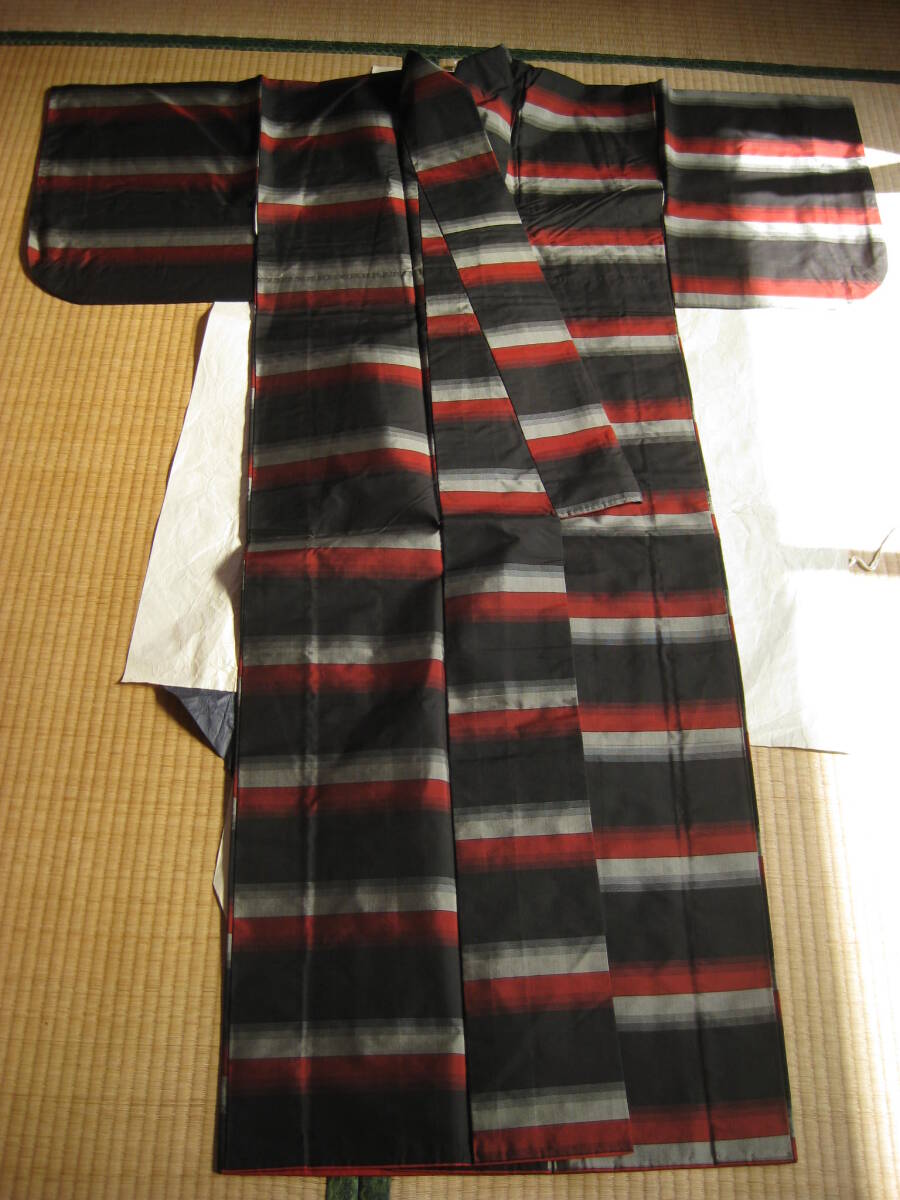 - 大島紬 着物 羽織 アンサンブル 2点 赤 黒 グレー