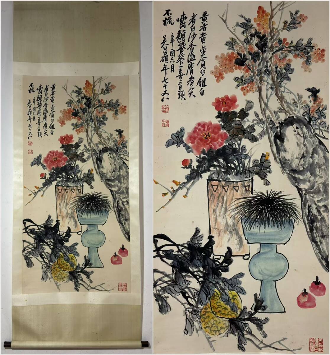 - 古美術 掛け軸 中国・近現代 「呉昌碩書」 紙本 【富貴神仙図】 立軸 書道 巻き物 肉筆保証 唐物 古画 画心138x68cm LT-250228