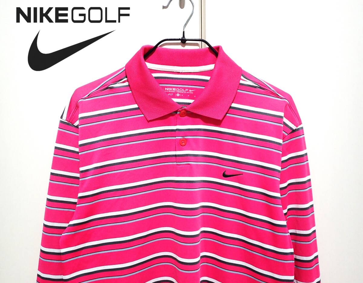 > ☆NIKE GOLF ☆ナイキ ☆スポーツウエア ☆ゴルフウエア ☆ボーダー柄 ☆長袖ポロシャツ ☆ピンク ☆メンズ ☆M