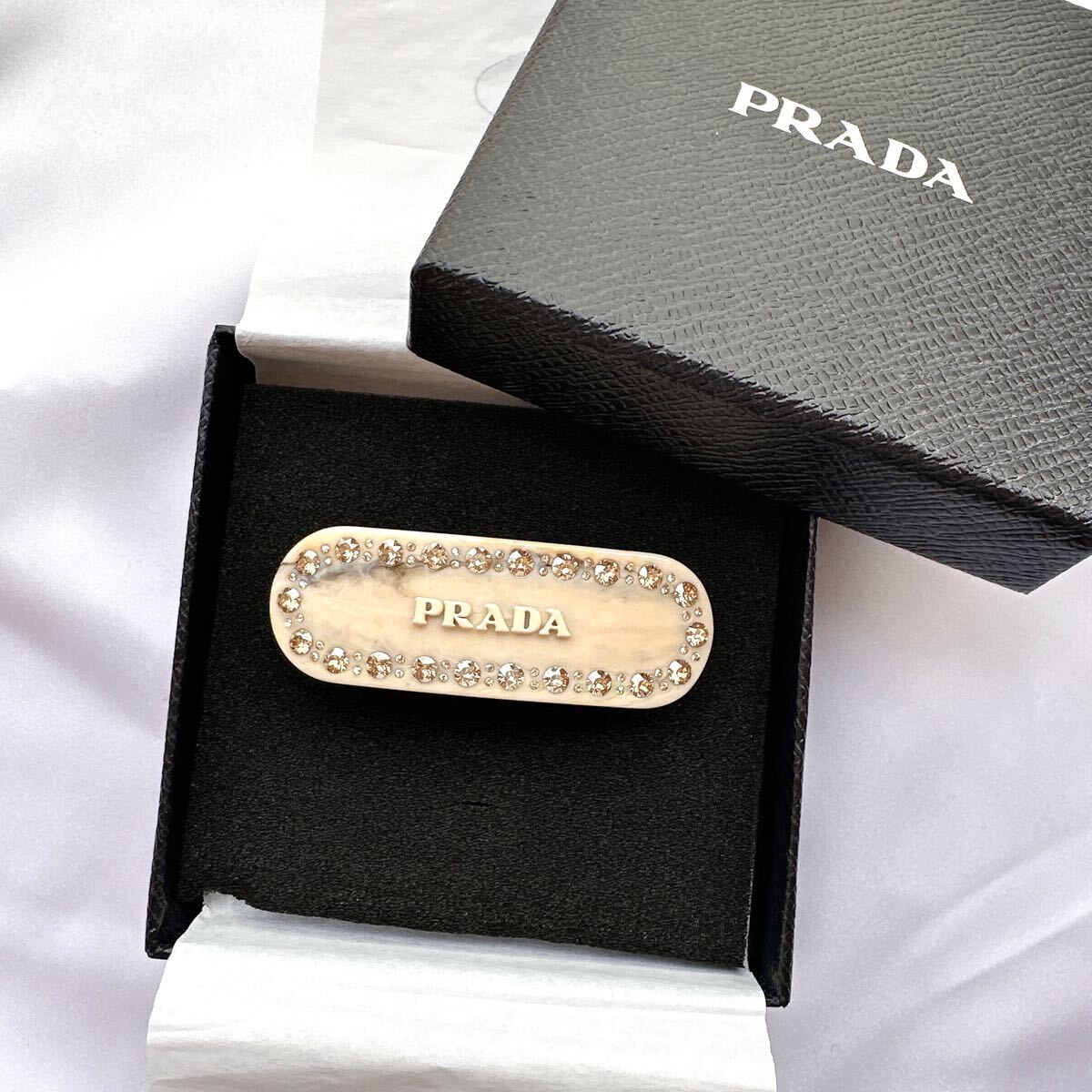 - PRADA プラダ ロゴ入り ラインストーン バレッタ ヘアクリップ 髪留め ヘアピン アクセサリー 箱付 正規品 極美品