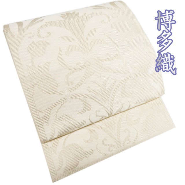 > 特選 名古屋帯 なごや帯 中古 リサイクル 正絹 カジュアル 仕立て上がり 博多織 植物文様 生成色 きもの北條 A1148-14