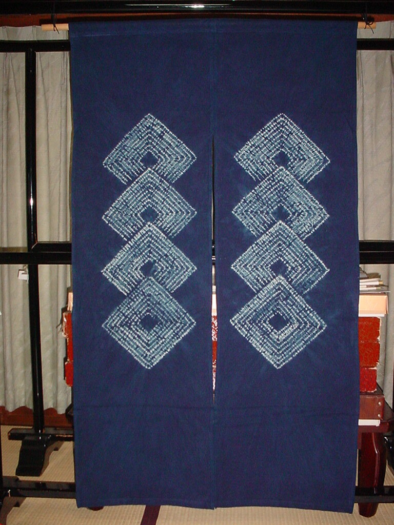- 【 藍染のれん「 連菱 」 藍染 絞り加工 のれん 天然染料(藍染) 綿100% インテリア用品 海外土産 (株)名古屋大森 謹製 新品 】