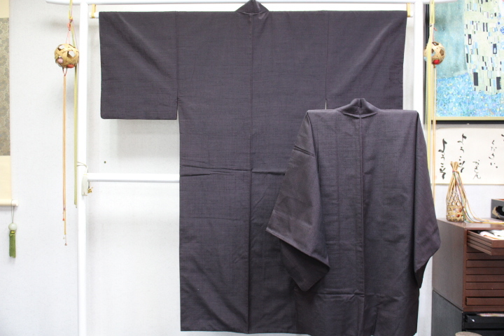 - きもの今昔8233 男和服 正絹紬アンサンブル 焦げ茶色紬の節糸を横に入れた ダイナミックな紬 身丈139cm