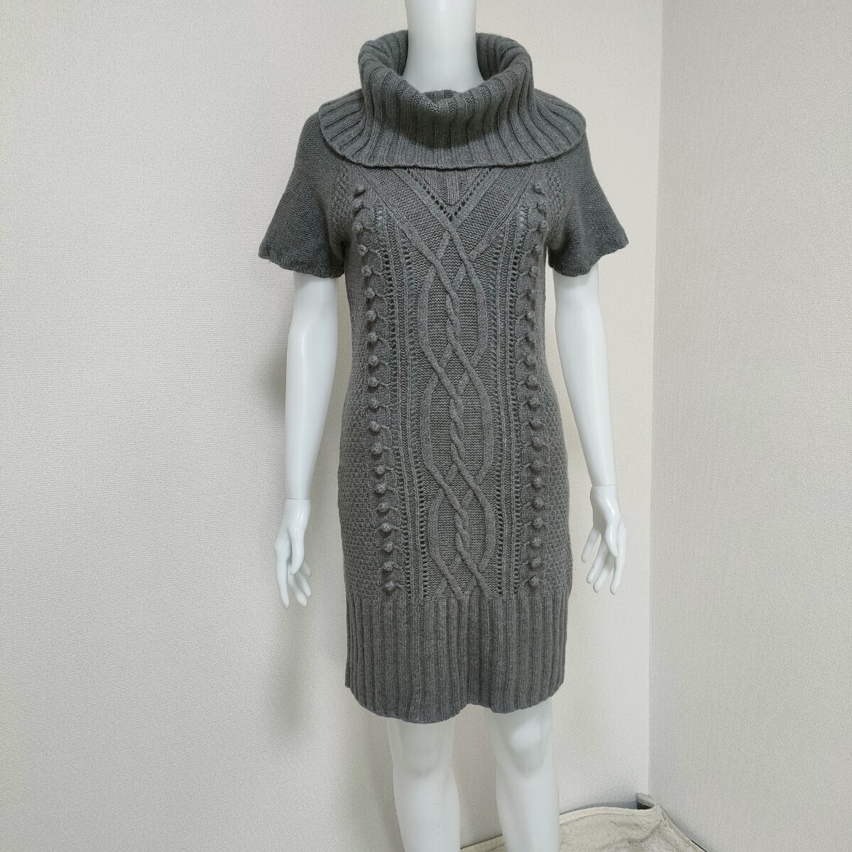 > H&M エイチ&エム フェミニン ケーブル編み タートルネック Iライン 半袖ニットワンピース 日本Mサイズ相当 グレー