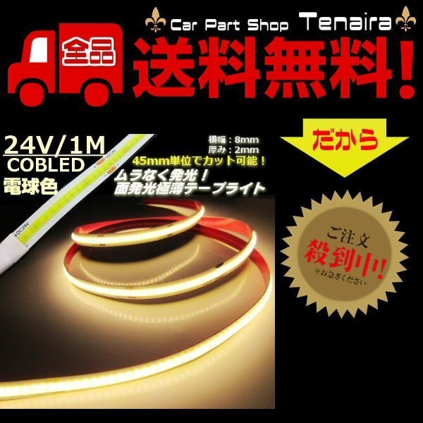 - 24v COB 面発光 LED テープライト 1m巻 極薄2mm 電球色 暖色 ウォームホワイト 色ムラなし カット可 ランプ アンドン メール便送料無料/6