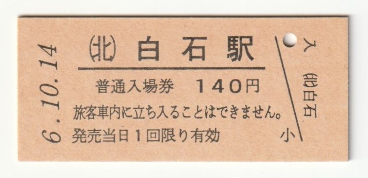 - 平成6年10月14日 東北本線 白石駅 140円硬券普通入場券(日付印刷)