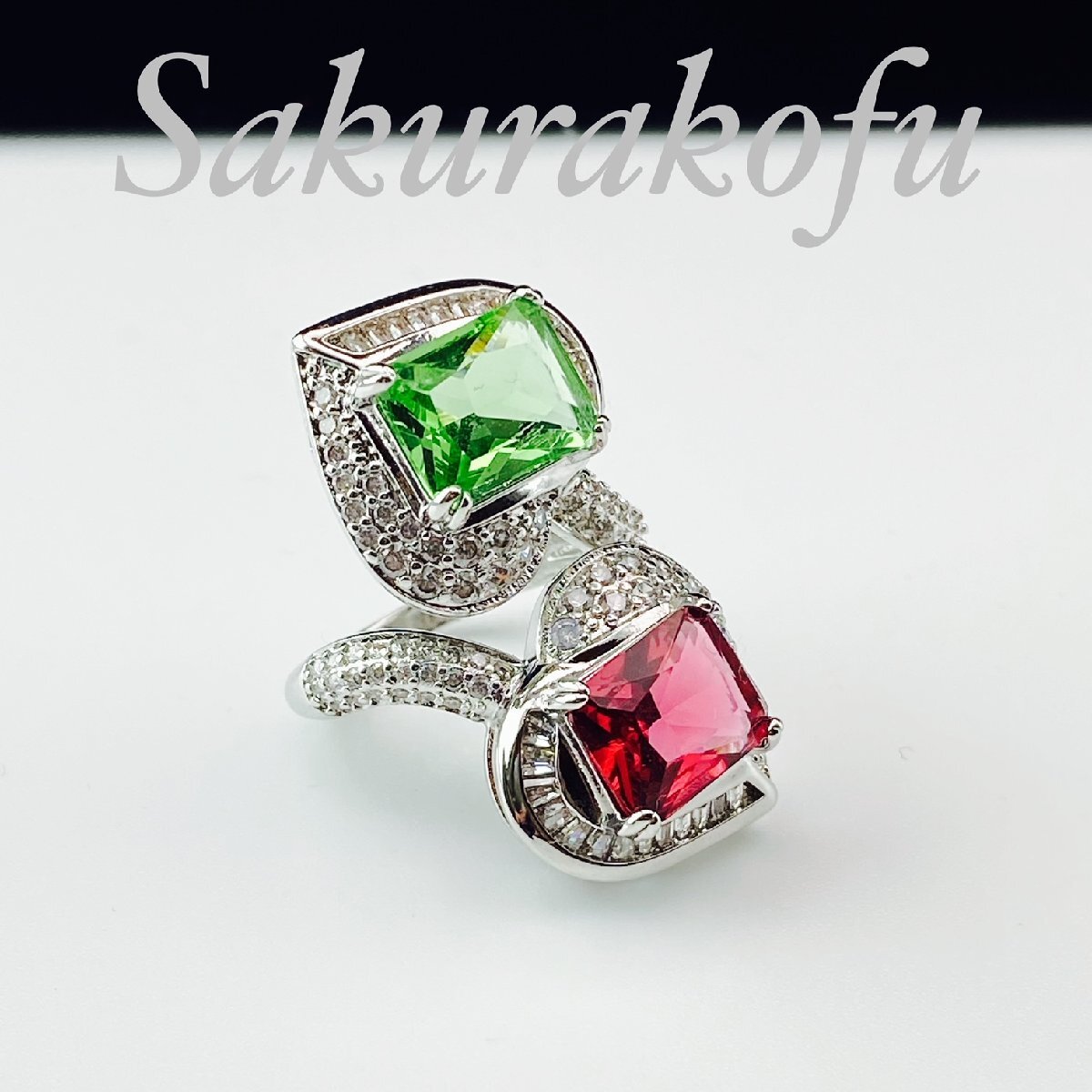- 送料無料 レディース 指輪 人気デザイン ゴージャス バイカラー ガーネット ペリドット ジルコニア シルバーリング(D145)