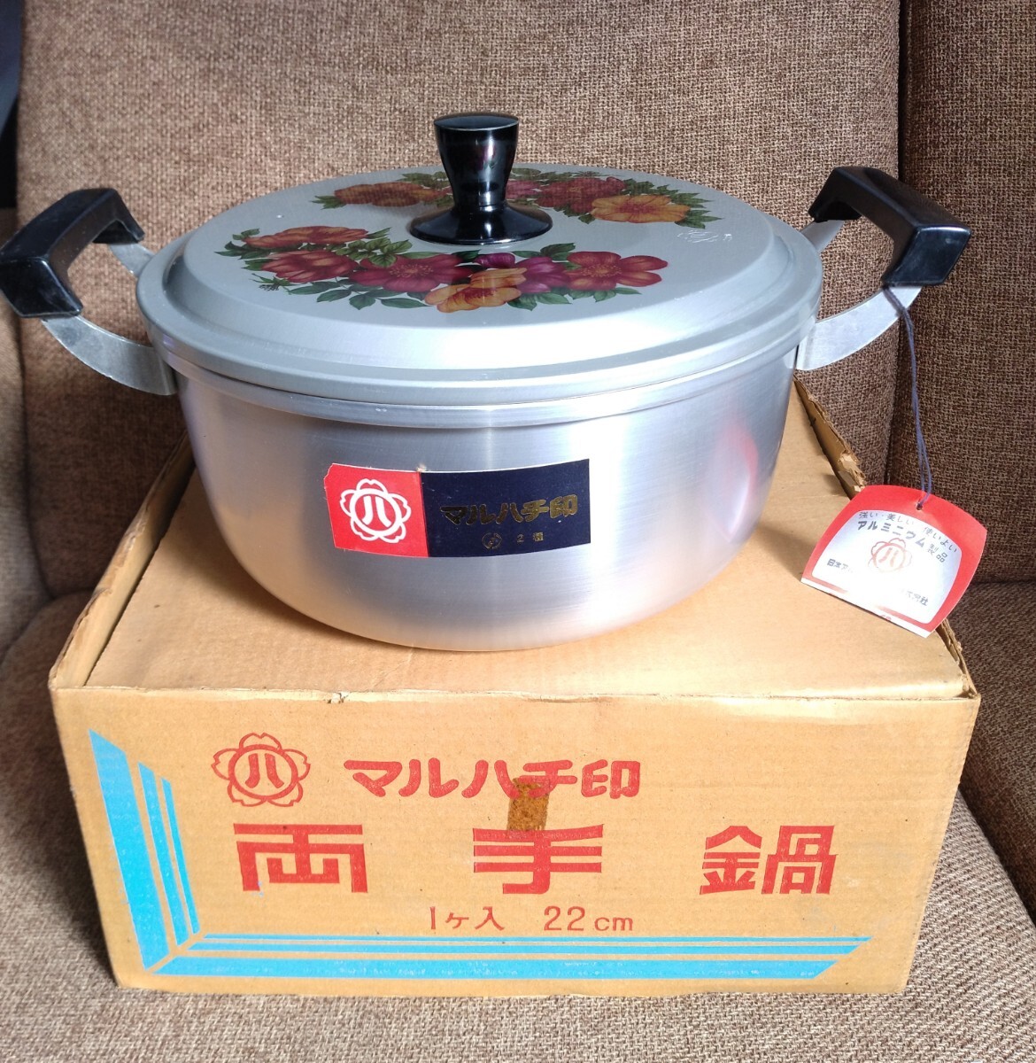 - K879【未使用】 マルハチ印 22cm 両手鍋 当時物 昭和レトロ 日本アルミ 長期保管