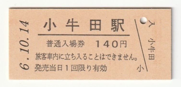 - 平成6年10月14日 東北本線 小牛田駅 140円硬券普通入場券(日付印刷)