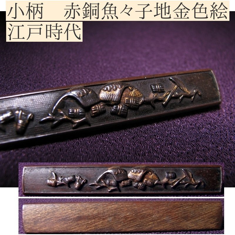 - 時代武具 小柄 赤銅魚々子地金色絵 桐箱付 江戸時代/鐔/25b043