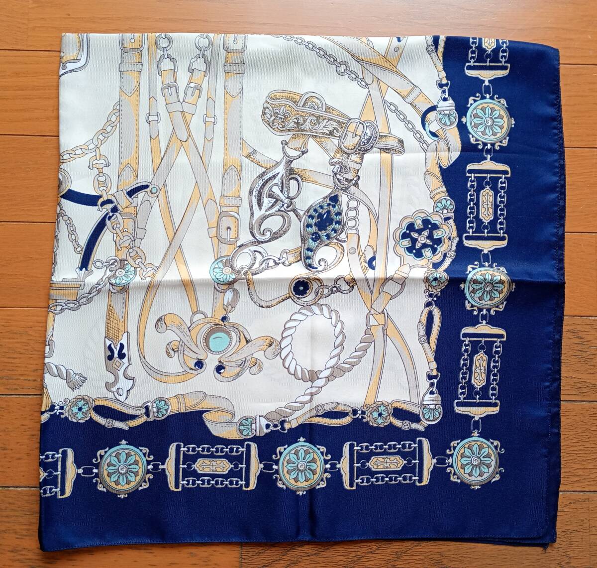- レトロ 大判 スカーフ 鎖 ベルト 豪華な柄 ゴージャス柄 ネイビーxベージュ イタリア製 ポリエステル素材 約89cmx約89cm