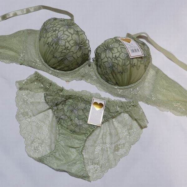 > Last 寄せ上Wパッド E75M 総レース お華刺繍 ビジュー付 モールドブラ&ショーツ グリーン
