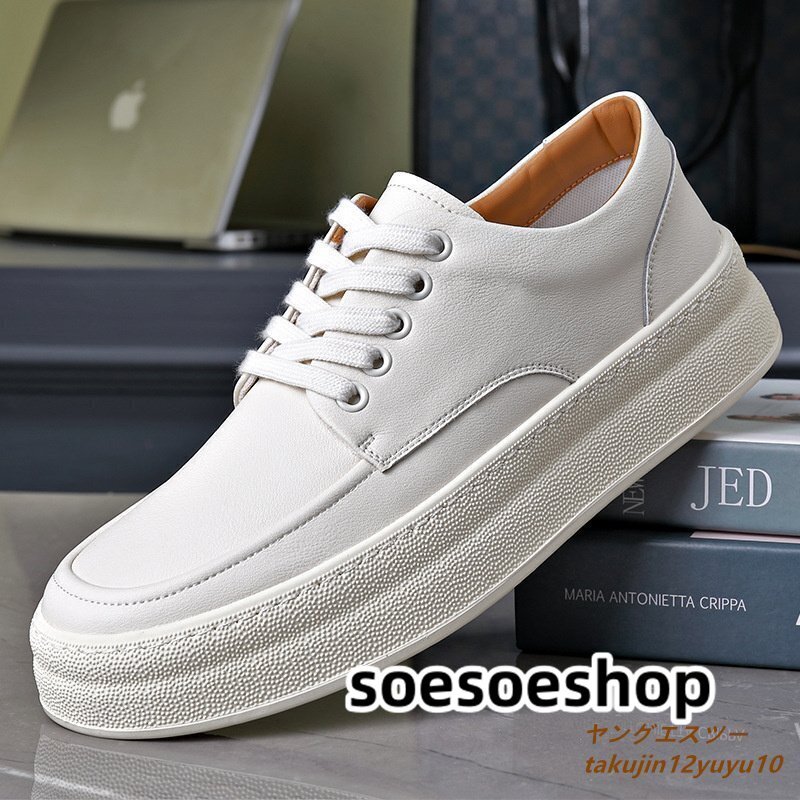 > 新品セール◆スニーカー メンズ 牛革 滑り止め 厚底 本革レザーシューズ 身長アップ 通気性 快適 お洒落 ドライビングシューズ 白系 27.5cm
