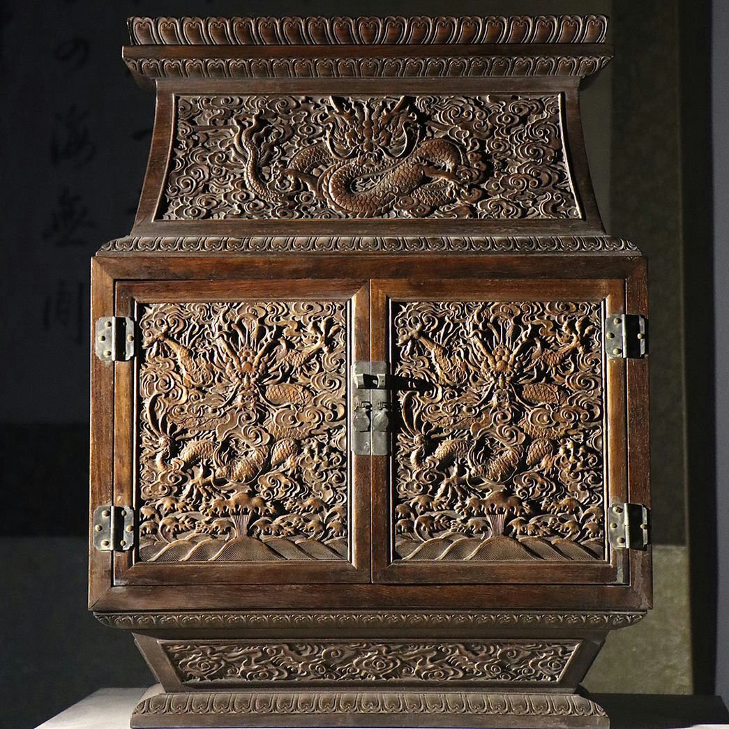 - ▼渡鶴羽▼E1470清時代 黄花梨 彫龍櫃 黄花梨木細密細工★古置物★古賞物★古擺件★蒐集家放出★唐物