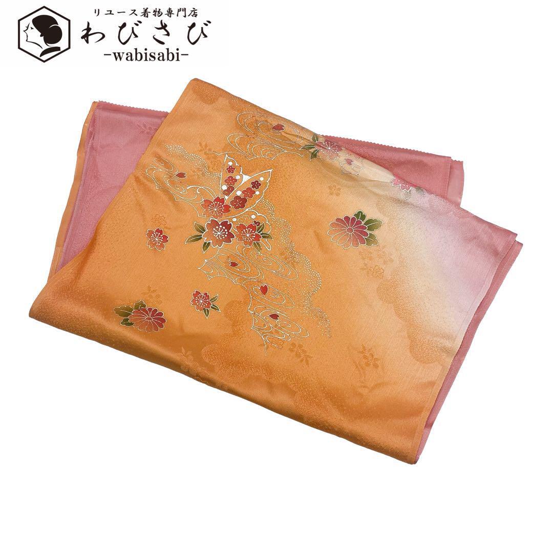 橙色と長春色のお色味の暈しに花模様や蝶々の柄裄がデザインされた品のある素敵なお品でございます。