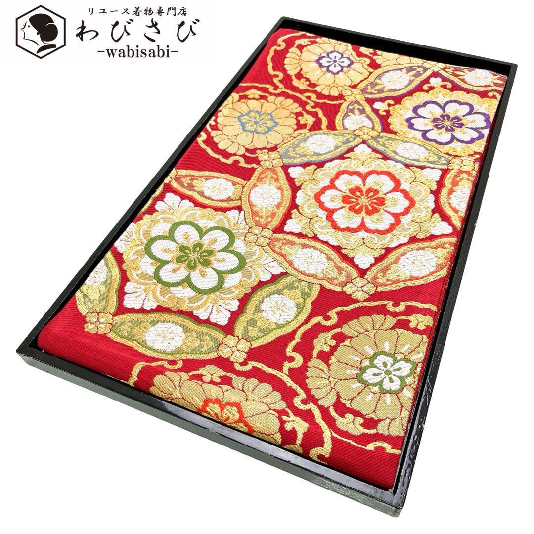 - 袋帯 雪輪に美しい華柄模様 金糸 赤色 振袖 O-4771 着物 きもの kimono 和服 和装 中古 リサイクル着物 【送料無料】