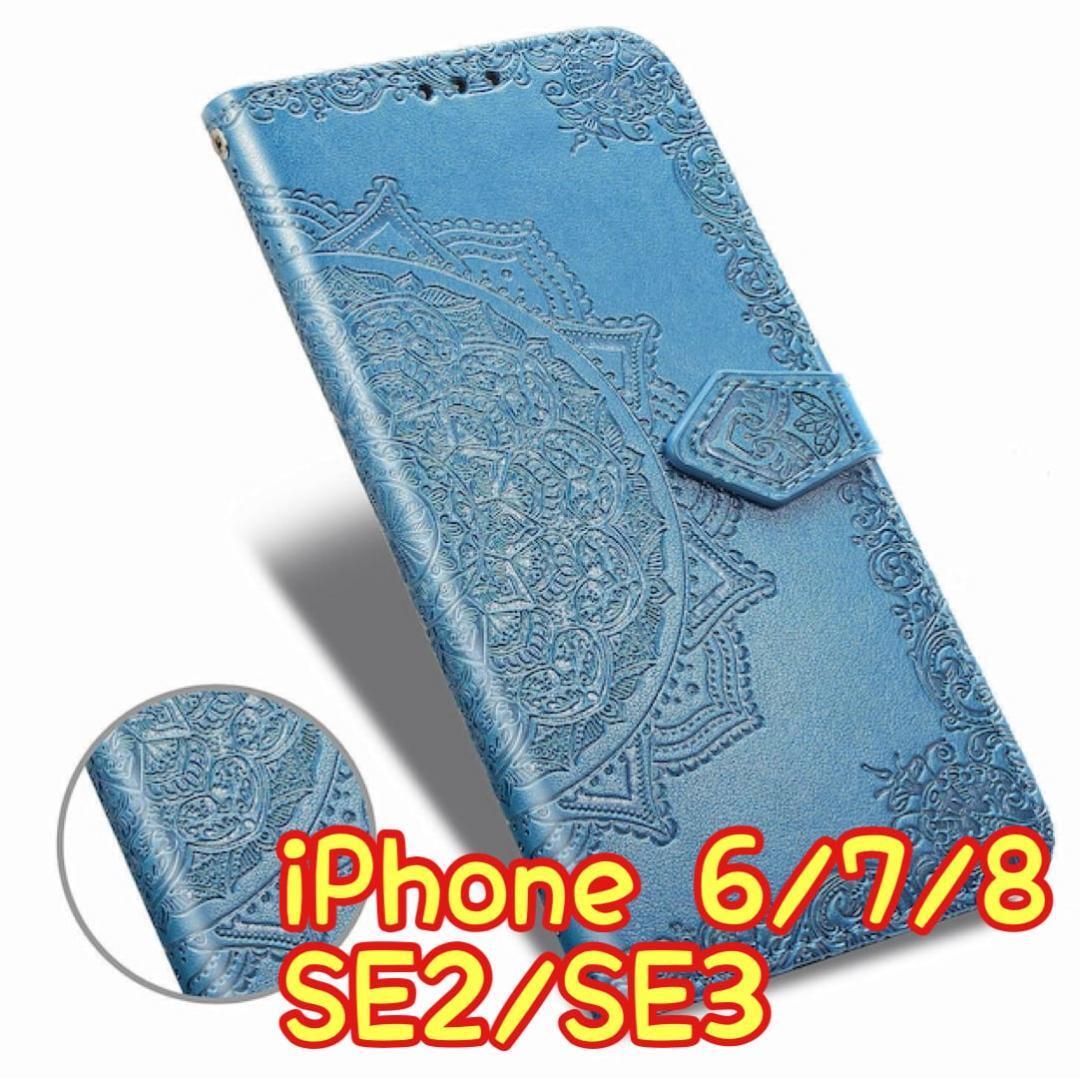 > エンボス加工スマホケース 手帳型 iPhone SE2/SE3ブルー