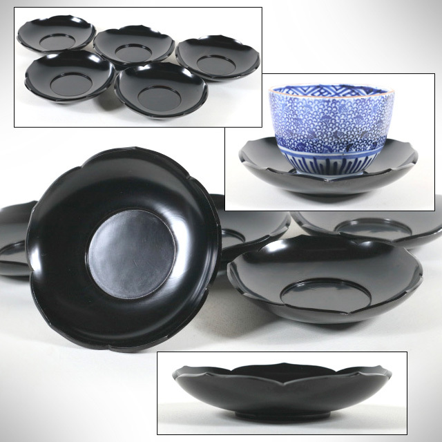 輪花、蓮華形の可愛らしい漆塗木製の茶托です。光沢のよい美しい黒真塗、形状も美しくおススメの一品。お使い用としてはもちろん、