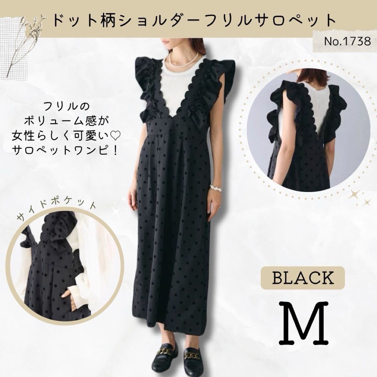 - ドット柄 ショルダーフリルサロペット M ワンピース サロペット 水玉 黒