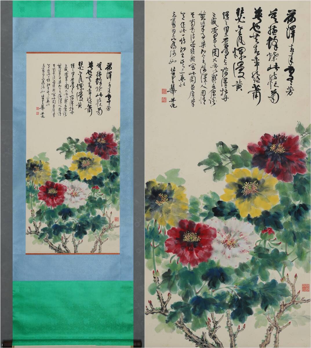 - 古美術 掛け軸 中国・近現代 「謝稚柳書」 紙本 【秋菊争艶図】 立軸 書道 巻き物 肉筆保証 唐物 古画 画心106x50cm LT-250367