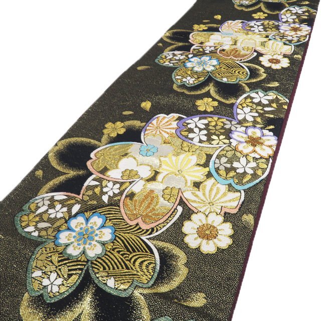 - 袋帯 振袖用 中古 リサイクル 正絹 フォーマル 仕立て上がり 六通 花模様 桜 箔糸 黒色 多色 金 きもの北條 A1159-8