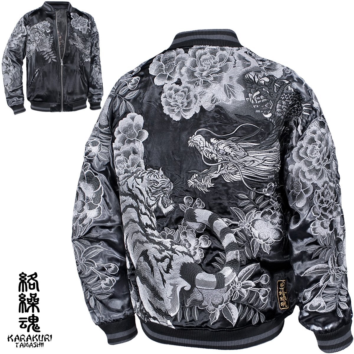 - 213010-25 絡繰魂 粋 スカジャン 龍 虎 和柄 リバーシブル 刺繍 フルジップ サテン 光沢 ブルゾン メンズ(グレー灰ブラック黒) L