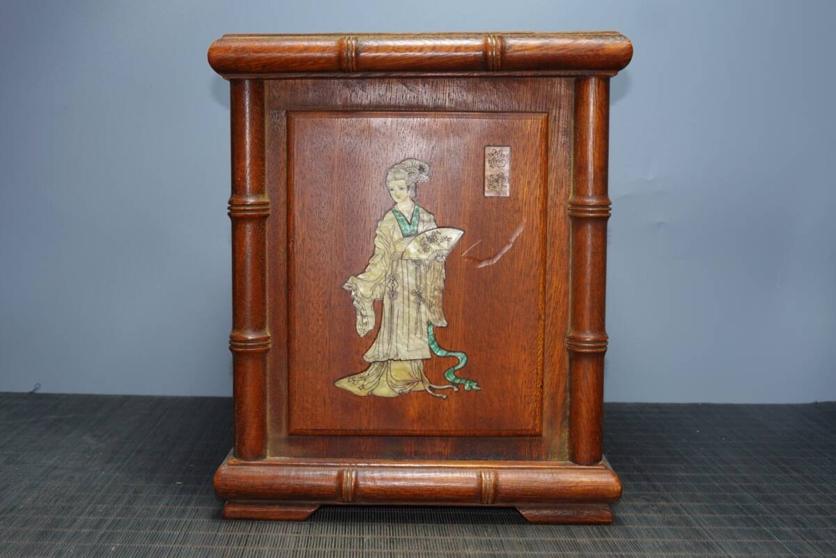 - ▽鴻▽ 花梨木製 細密彫 貝殼嵌 彩繪 四大美女紋 画筒 置物 古賞物 中国古玩 中国古美術