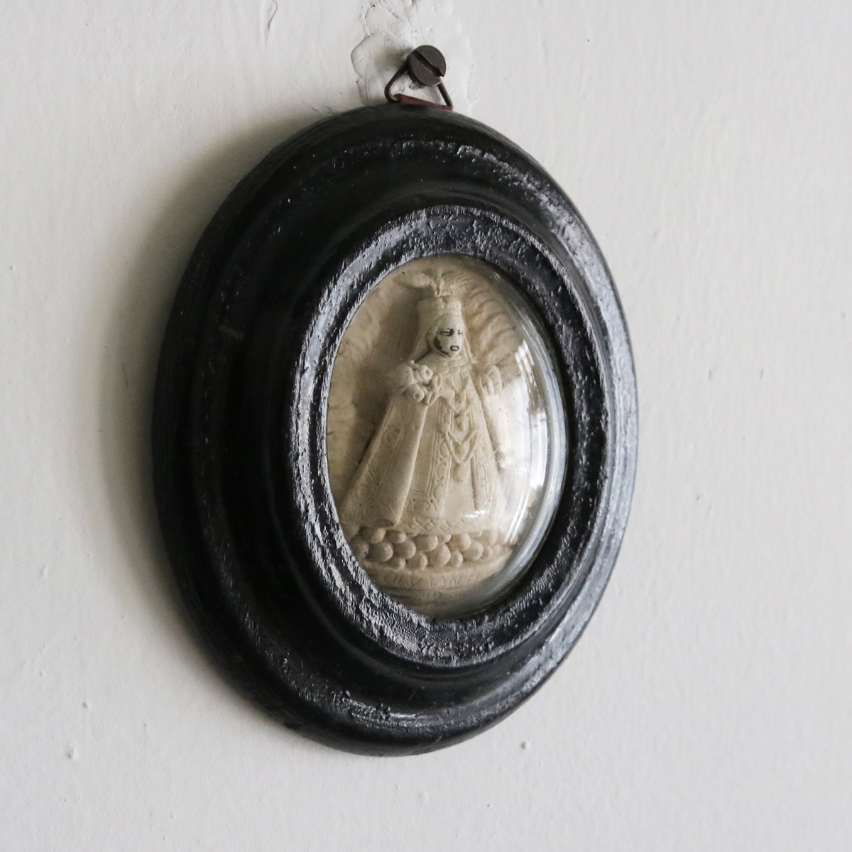 - 19世紀 1800年代 ガラスドーム 木製 黒いマリア 黒マリア 教会 キリスト マリア フランスアンティーク 聖品 装飾 クロス 十字架 メダイ HAL