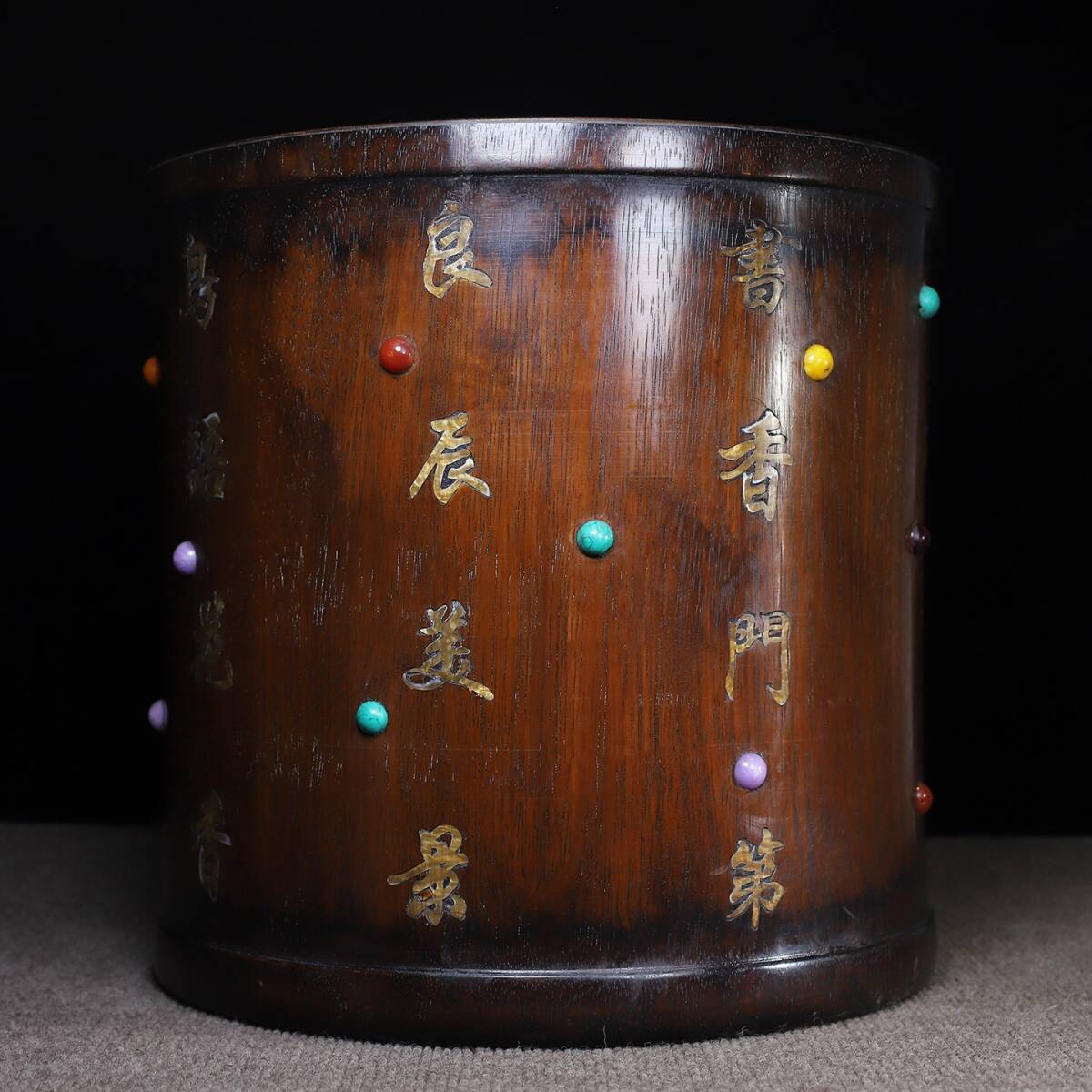 - ▽鴻▽ 花梨木製 細密彫 貝殼嵌 花鳥紋 筆筒 置物 古賞物 中国古玩 中国古美術