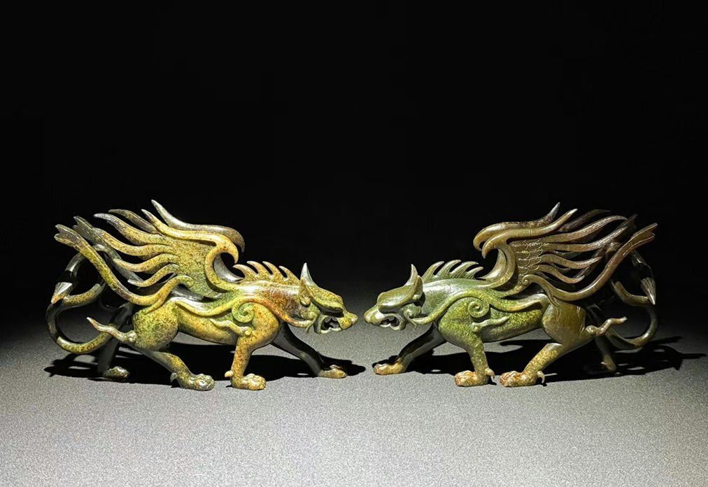 - ■観心・時代旧蔵■K1066漢時代 和田古玉 和田玉古獣一対 時代古玉細密細工★古置物★古賞物★古擺件★蒐集家放出★唐物