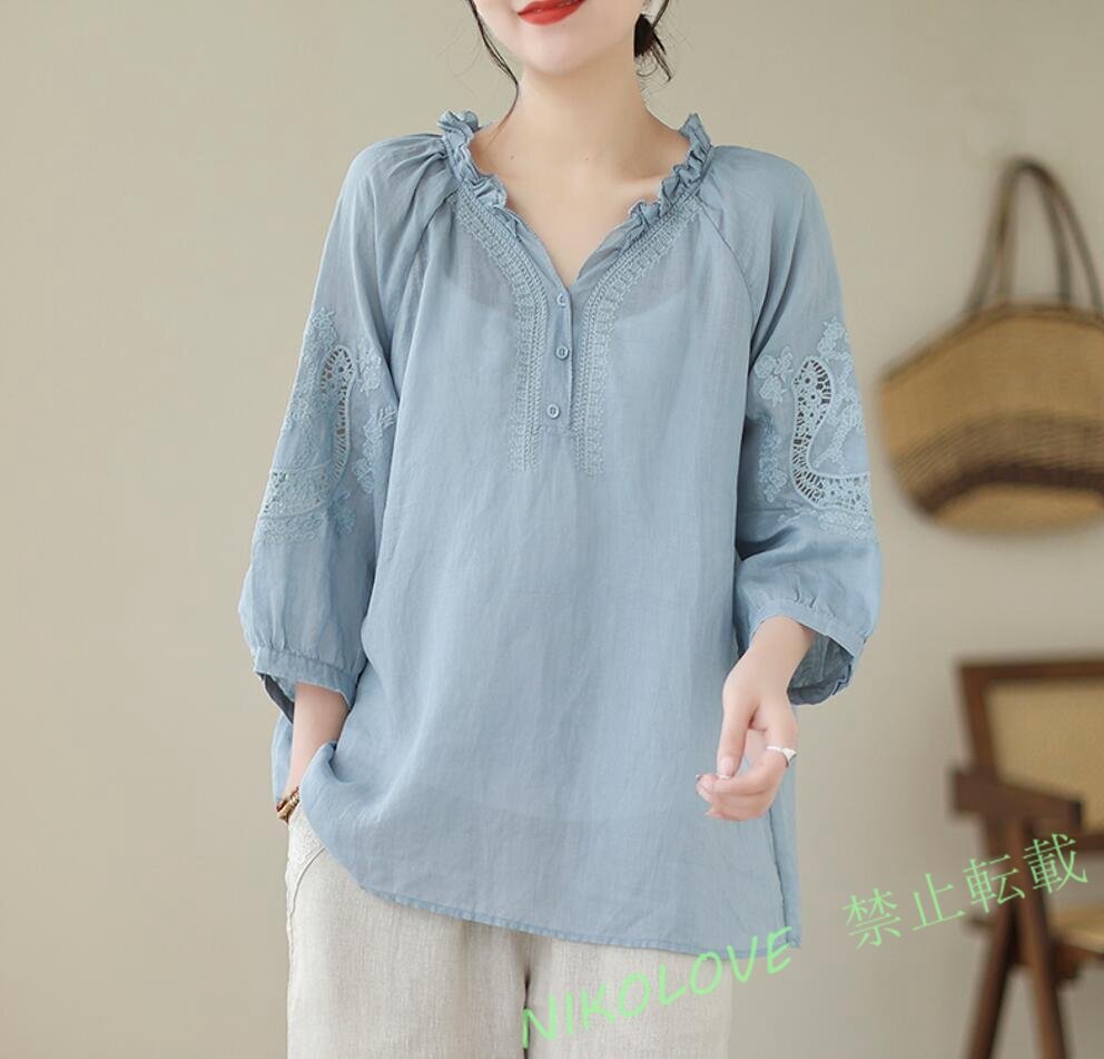 - 新品夏刺繍 ブラウス 上品 レディース チュニック 七分袖 花柄 カジュアル ナチュラル 体型カバー トップス 綿麻 おしゃれ 水色 LJ125