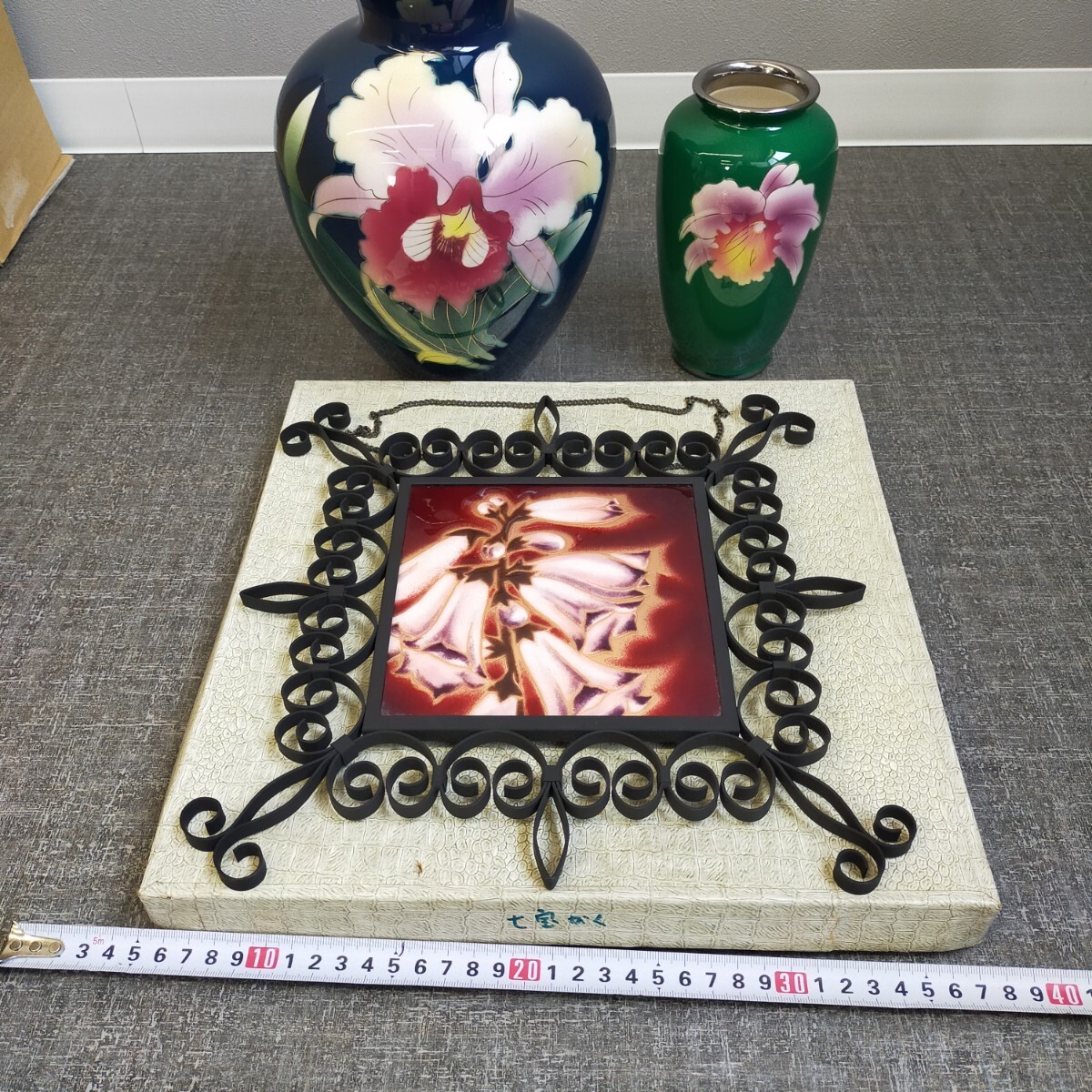 - す2716 美品 七宝 花器 レリーフ 黒翠 富士 安藤 花瓶 箱付 フラワーベース 花生 カトレア蘭飾り 壁掛け インテリア 陶板 まとめ
