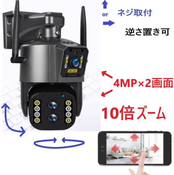 - 10倍ズームWifiネットワークカメラ 4MP×2画面 夜間カラー撮影 人検知自動追跡録画アラーム発光威嚇 通話 遠隔スマホ操作★鄭AV