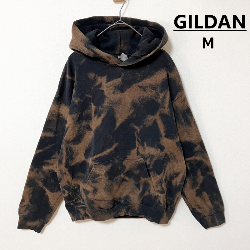 - GILDAN タイダイ柄ブリーチプルオーバーパーカーM 黒 ブランド 裏起毛