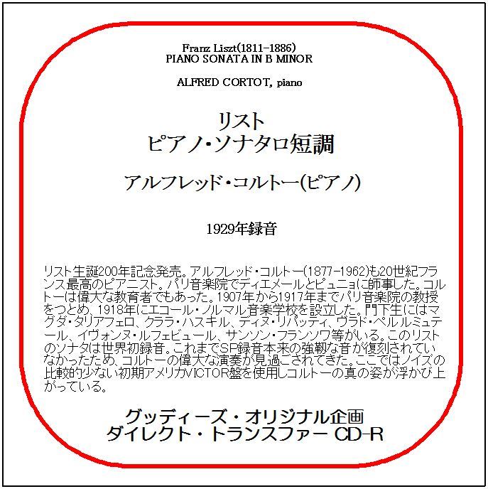- リスト:ピアノ・ソナタロ短調/アルフレッド・コルトー/送料無料/ダイレクト・トランスファー CD-R