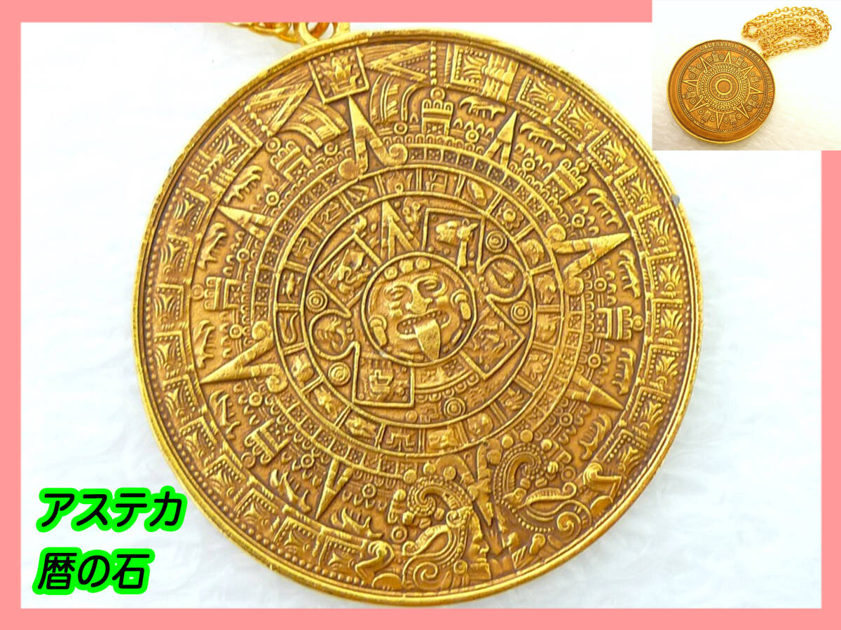 > 未使用 アステカ暦の石 ネックレス カレンダー コイン マヤ文明 太陽の石 メキシコ 取説 合金 スピリチュアル 浄化 ゴールド ペンダント