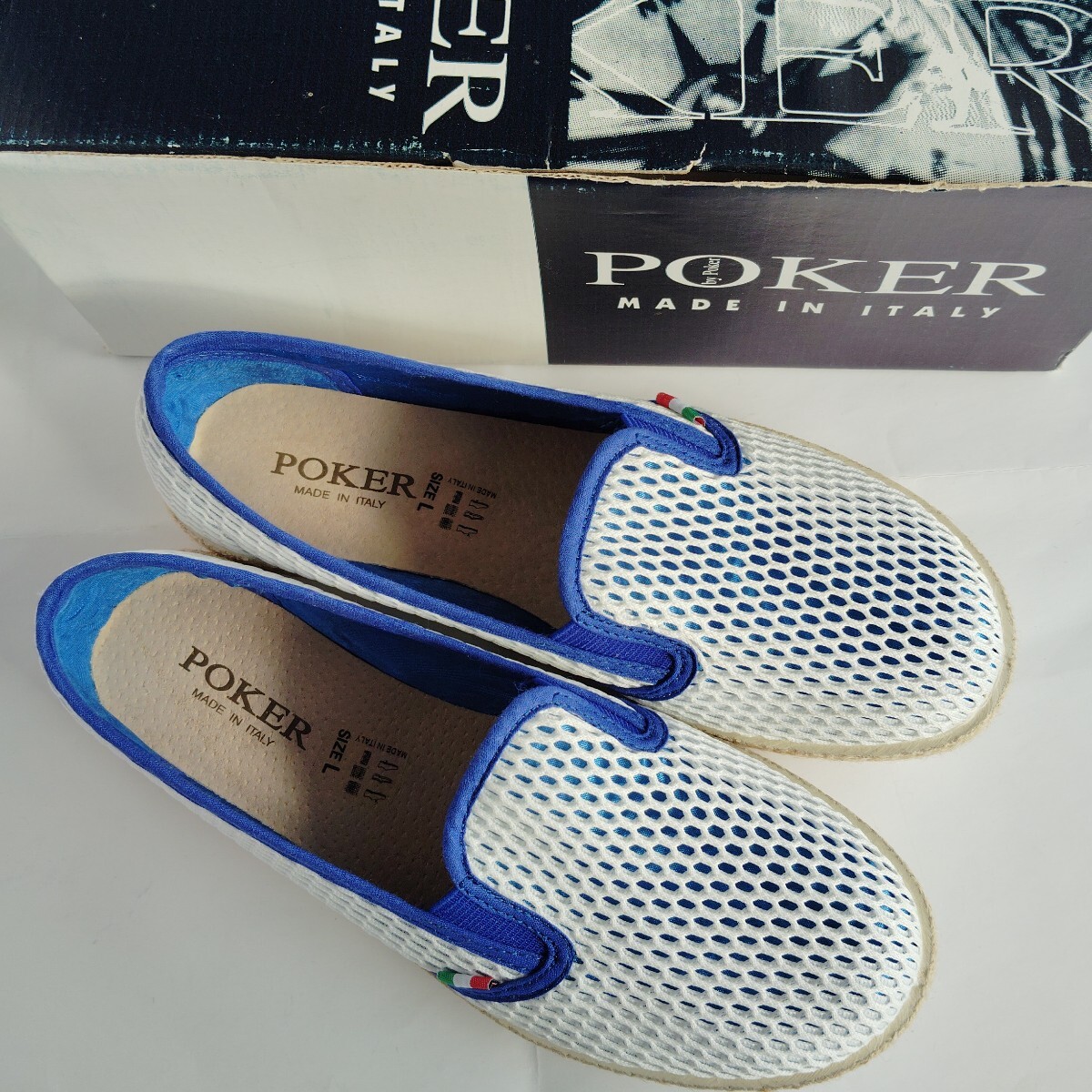 - 新品 箱付き POKER ポーカー スリッポン シューズ L サイズ 23.5 白 ブルー スニーカー靴レディース夏用シューズ イタリア製
