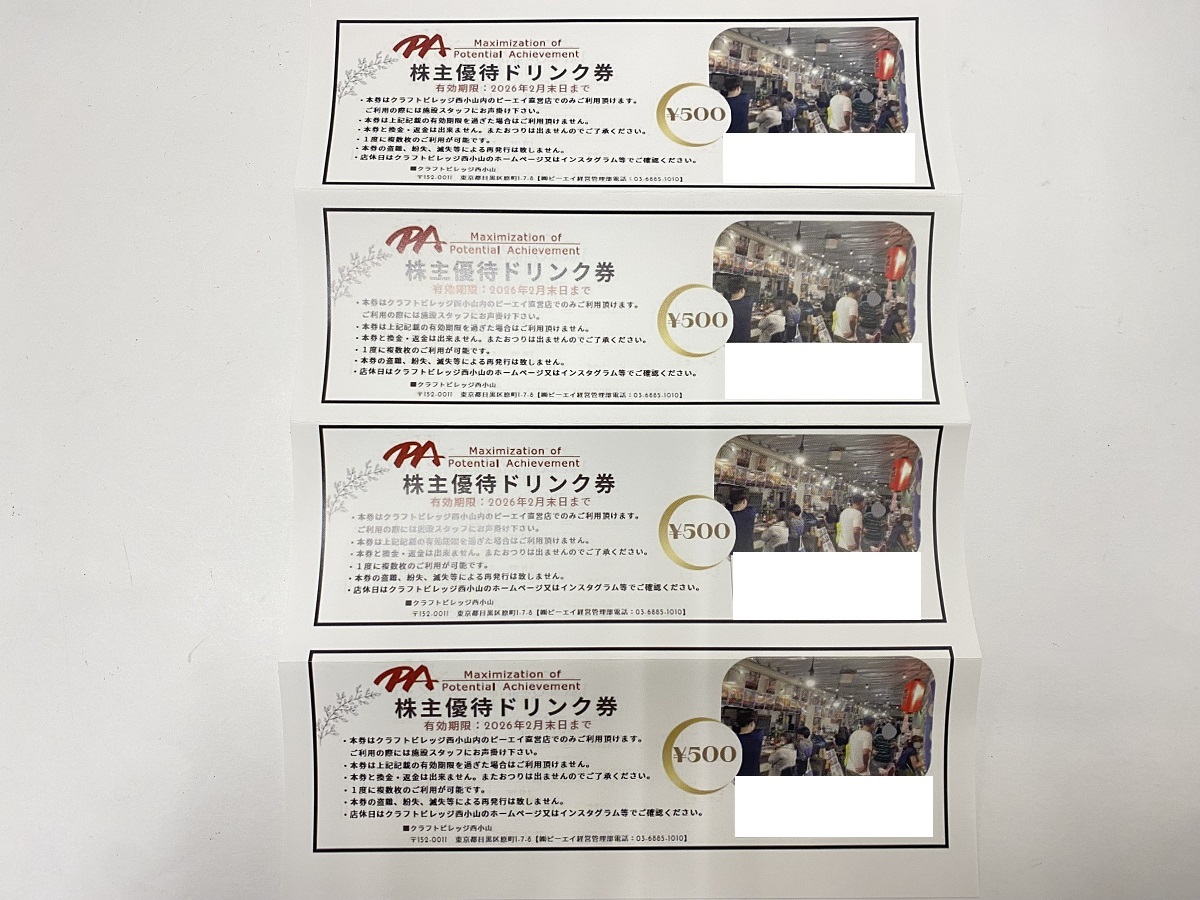 > 【大黒屋】即決 ピーエイ クラフトビレッジ西小山 株主優待券 ドリンク券 2000円分 (500円券×4枚) 有効期限:2026年2月末日迄