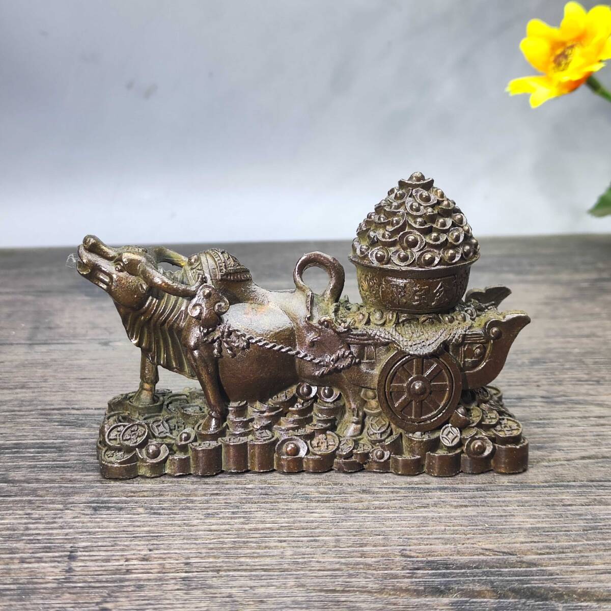 - 清 古銅彫 牛形 牛拉元宝 置物 極細工 古賞物 古美味 東洋彫刻 時代物 骨董 中国古美術