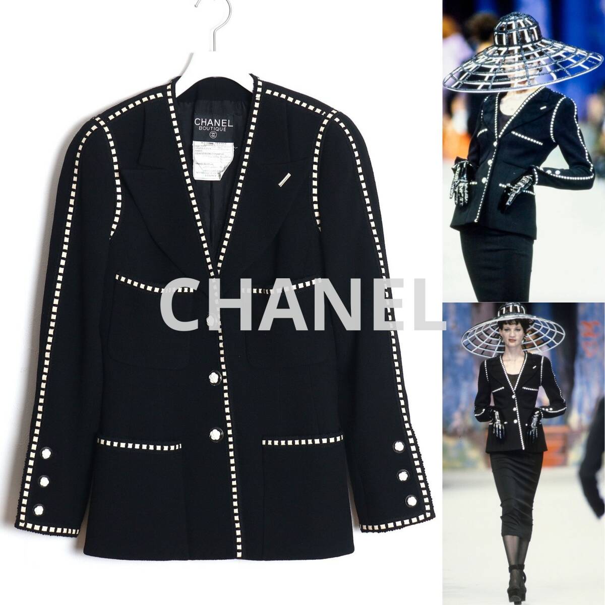 > CHANEL 1992SS カメリアボタン ウールテーラードジャケット FR38 ヴィンテージ アーカイブ ジョーゼット ツイード ブレザー ノーカラー