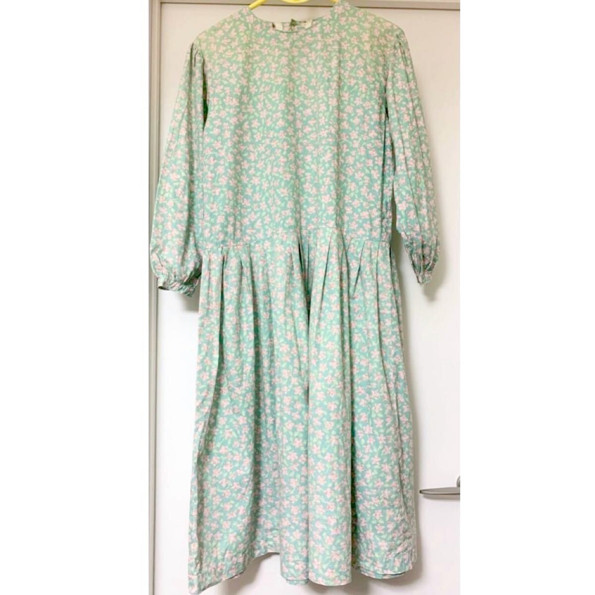 - ピンク小花柄コットン 長袖ワンピース オーバーサイズ ミントグリーン 緑 ロング丈 綿 水色グリーン