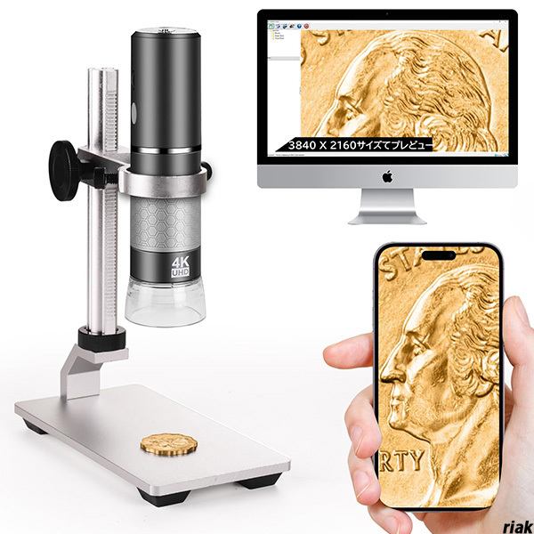 > 【携帯電話ではワイヤレス、PCでは有線接続が可能】顕微鏡4K プロフェッショナルスタンド付き デジタルUSB顕微鏡 HDカメラ搭載