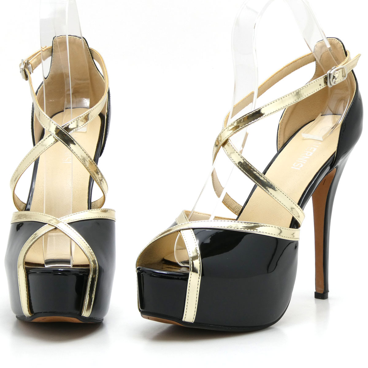 - 新品 大きいサイズ パンプス ブラック 27.5cm 131502-45 エナメル調 オープントゥ クロスストラップ 前厚底ストーム ハイヒール