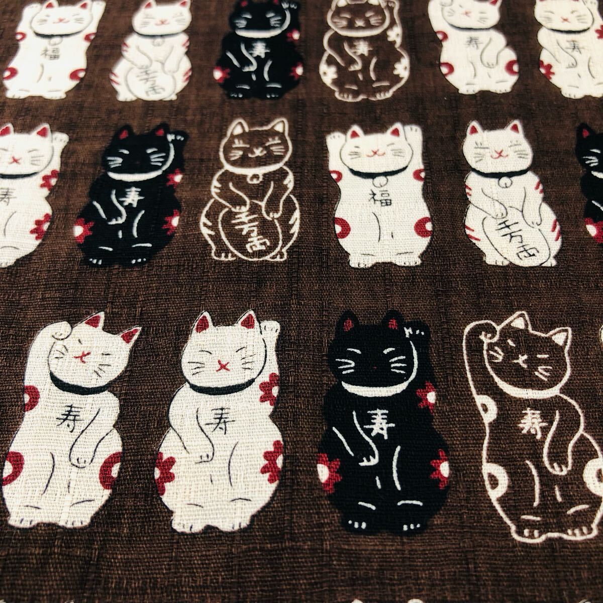 - はぎれ 110×30 招き猫 コットンドビー 和柄 猫柄 日本製 コスモテキスタイル 生地 ブラウン ネコ