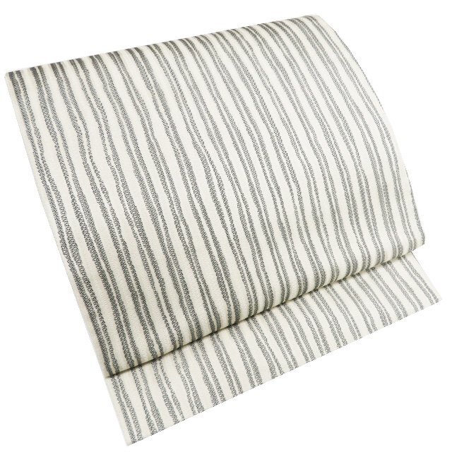 - 名古屋帯 なごや帯 中古 リサイクル 正絹 カジュアル 仕立て上がり よろけ縞模様 灰白色 黒色 きもの北條 A1171-15